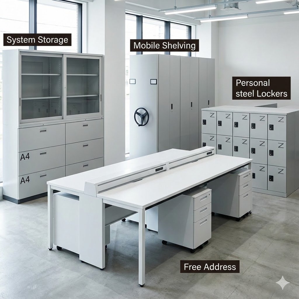 オフィス家具の主力である収納庫。私たちは日本のJIS規格サイズ(W900×D400/450)を熟知しており、日本のオフィスに違和感なく溶け込む製品を製造します。
